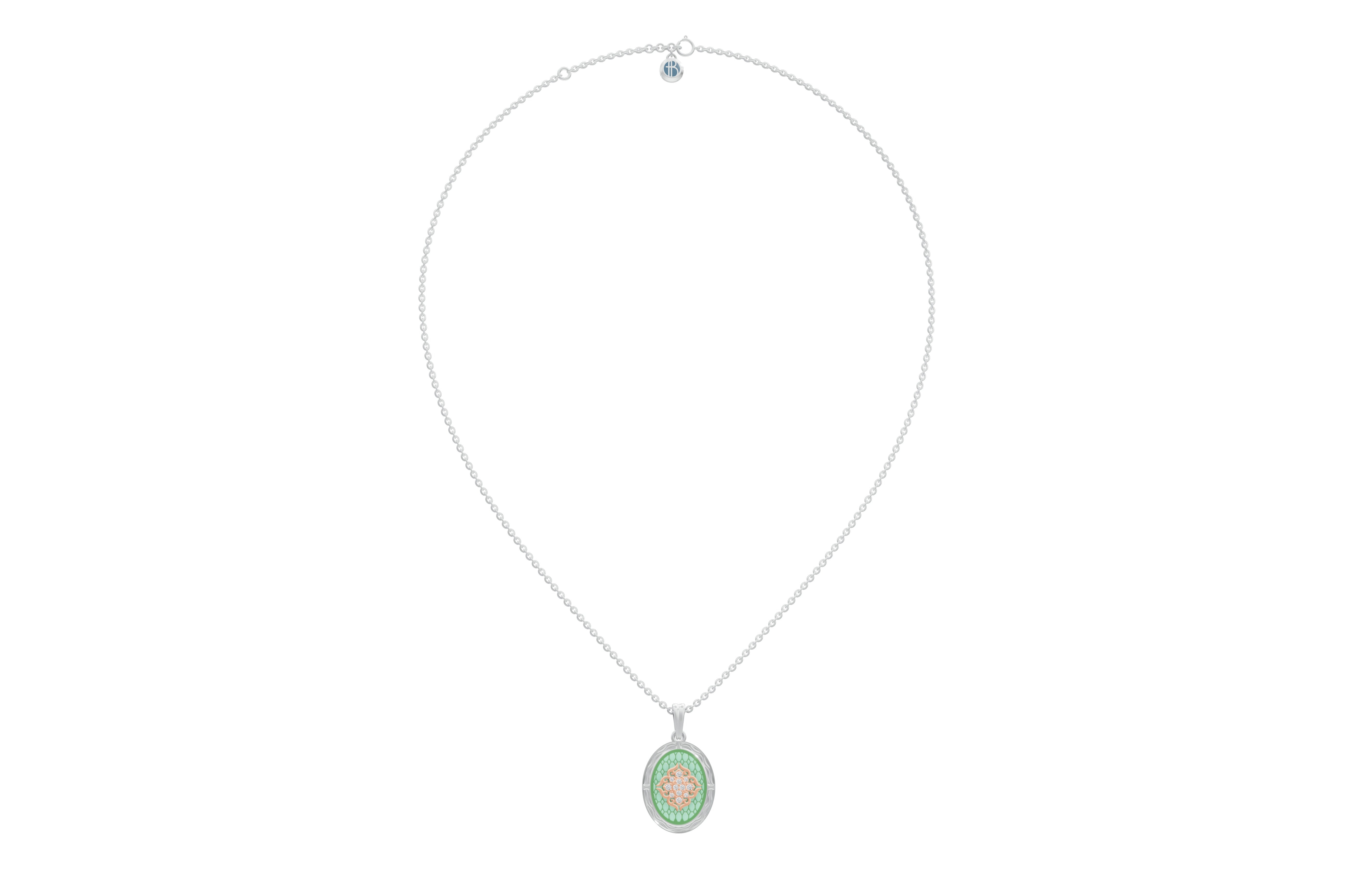 This Classic Oval pendant, crafted in Sterling Silver, mesmerizes mosaic of Enameled Jade green color, inspired by the intricate patterns of Persian art. This pendant is a symbol of harmony and balance that evokes a sense of timeless elegance.